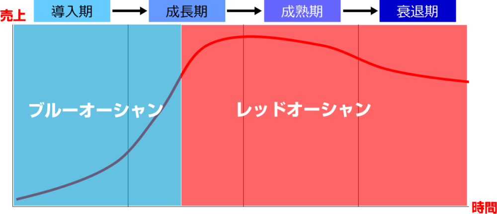 逆にライバルも多く飽和した市場をレッドオーシャンと呼ぶ。