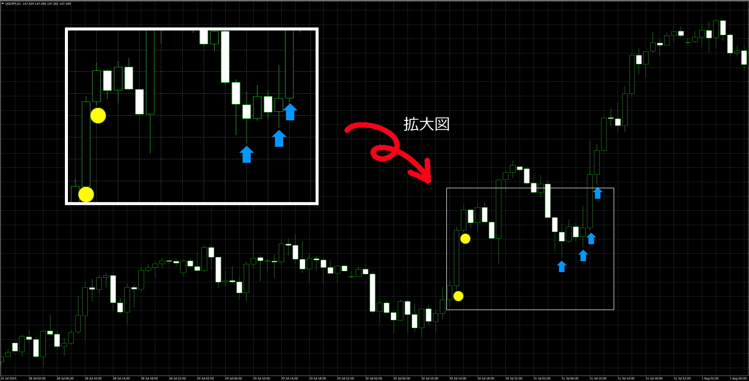 さらにトレンド転換では黄色●といったシンプルなマークが表示されます。
