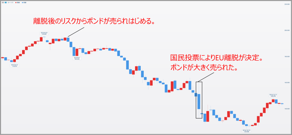 2015年末に「来年はいよいよブレグジットに対する国民投票が行われる」ということで仮に離脱となれば、英国にとって様々なリスクが生じることから急速にポンドが売られました。