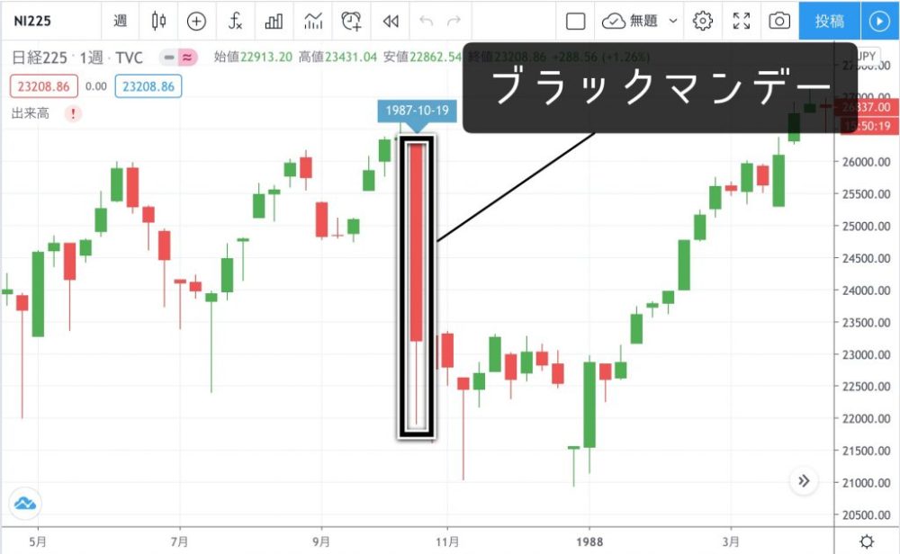 1987年10月19日の月曜日に起きた大暴落。月曜日に起きたことからブラックマンデーと呼ばれています。