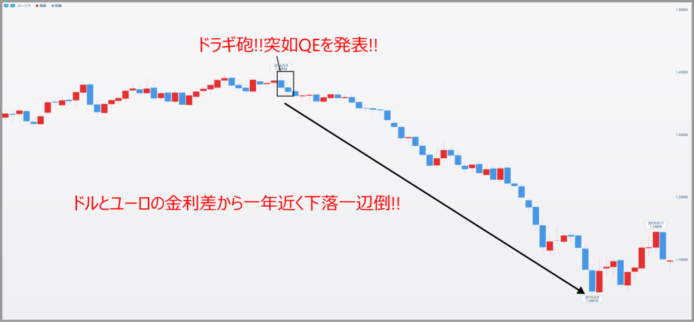 当時のECB総裁のマリオ・ドラギの突然の発表から「ドラギ砲」などと呼ばれました。これによりドルとユーロの金利差が広がりユーロ/ドルは長きに渡り売られることになったのです。