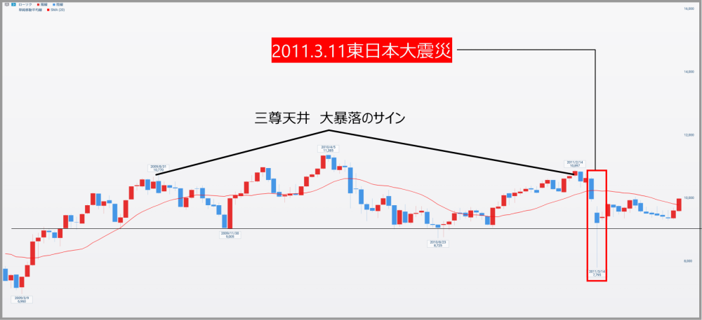 上記は東日本大震災の際の日経225チャートです。トレードを勉強している方なら分かると思いますが、三尊天井は大暴落のサイン。その三尊天井が地震発生の前週に発生。なおかつ、20日移動平均線を割った時に東日本大震災が発生しました。