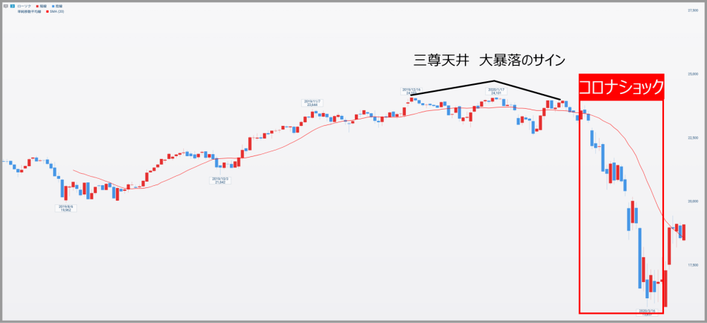 相場が大きく反応したのが、これも先ほどの東日本大震災と同じように三尊天井が形成され20日移動平均線を割った3日後の2月24日から。そしてその後、世界中でパンデミックが宣言され、事実上の「全世界緊急事態宣言」となり、国内でもはじめて緊急事態宣言が発出されたのです。