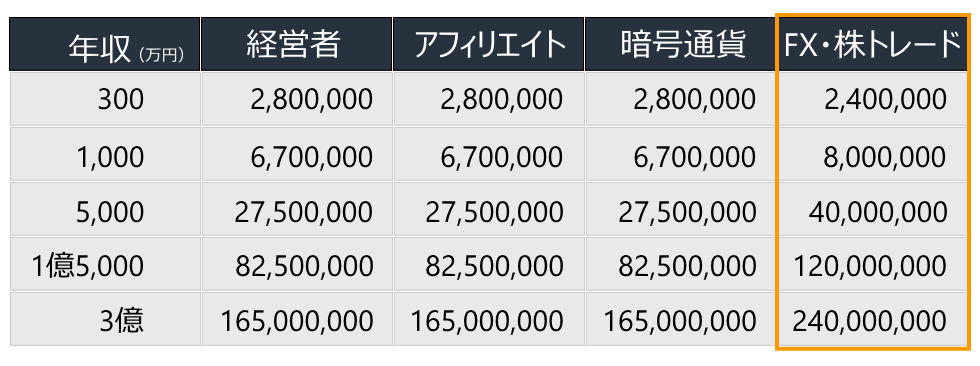 比較対象として出される経営者やアフィリエイトなどのネットビジネスがトレーダーよりお金が残るのは年収が300万円まで。ここまでは通常の累進課税の方が税率が低く設定されているが、330万円を超えるともう分離課税の方が安くなります。
